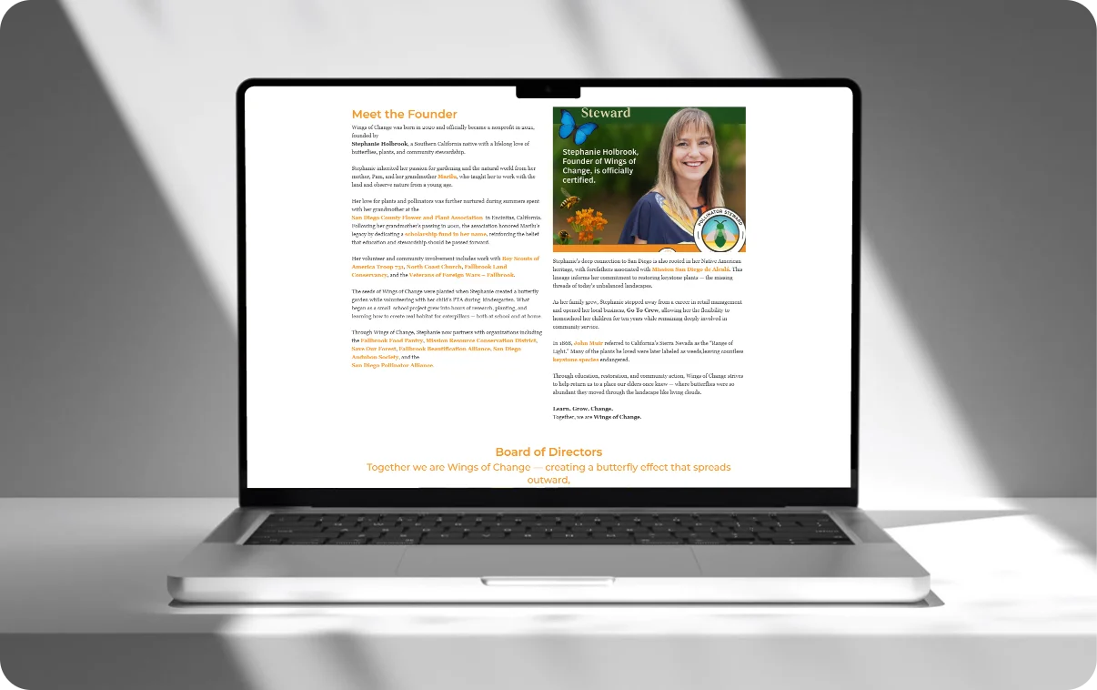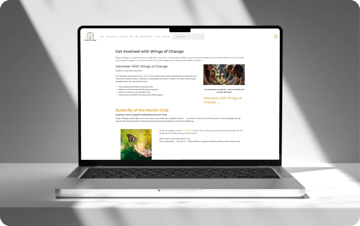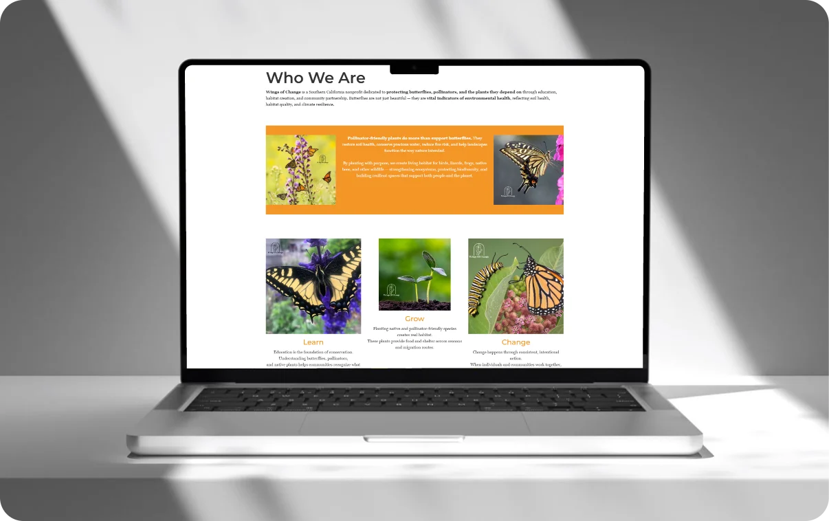 Wings of Change is committed to helping communities care for the land, protect pollinators, and understand how butterflies reflect the health of soil and ecosystems. Their website needed to showcase this mission in a clear, accessible, and visually engaging way.